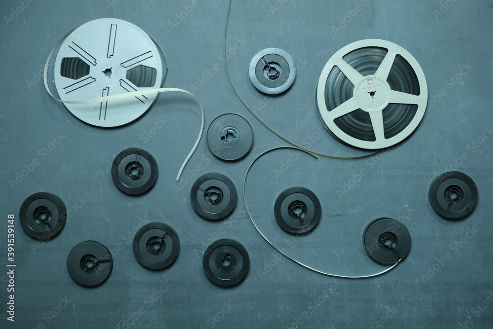 Pellicola film su sfondo lavagna. Cinema. Bobina filmica con proiettore #391539148