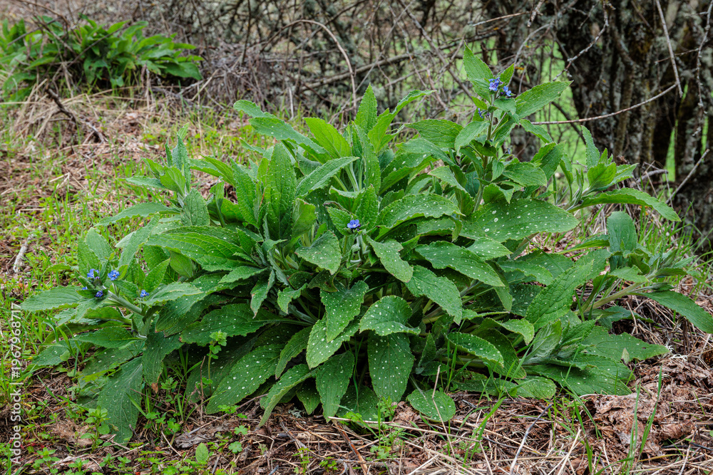 Pentaglottis sempervirens. Anchusa vulgaris. Ox-tongue plant with blue flowers. Green alkanet. #1967968717