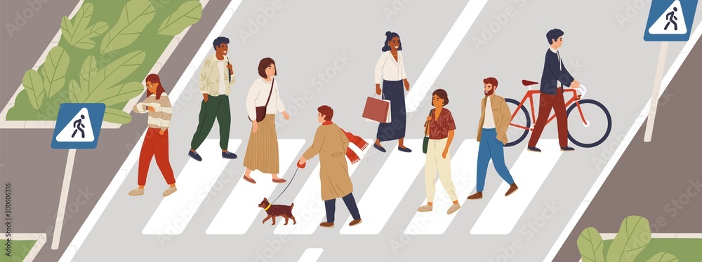 People at crosswalk flat vector illustration. Urban lifestyle concept. Male and female pedestrians crossing city street cartoon characters. Multiethnic community members. Rush hour idea. #300606316