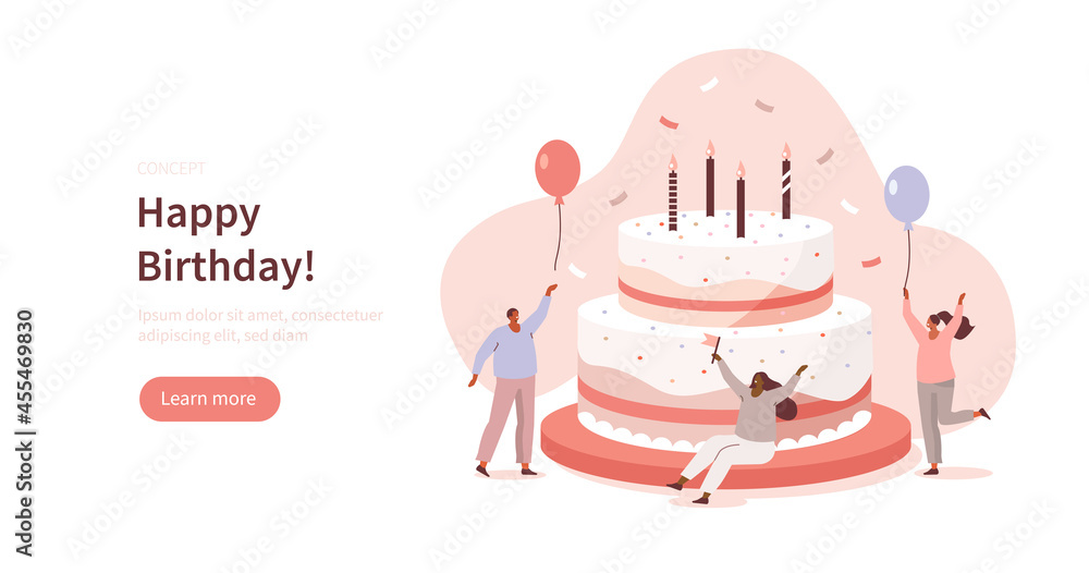People celebrating birthday party. Characters standing near birthday cake and holding balloons. Happy birthday concept. Flat cartoon vector illustration. #455469830