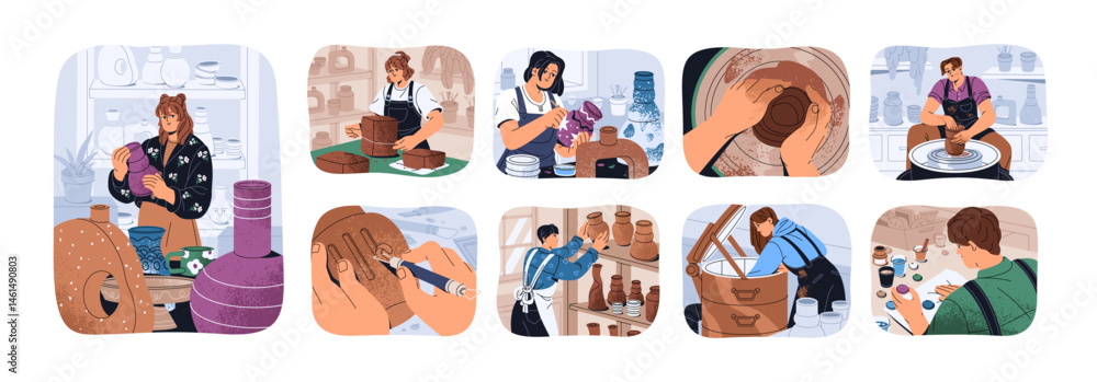 People do ceramics set. Artisans create crockery with pottery wheel in workshop. Potters work with clay, making handmade ware, vase in art class. Flat isolated vector illustrations on white background #1461490803