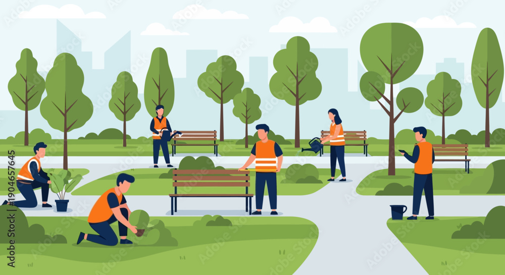 People gardening and enjoying a sunny day in a lush urban park setting. #1904657645
