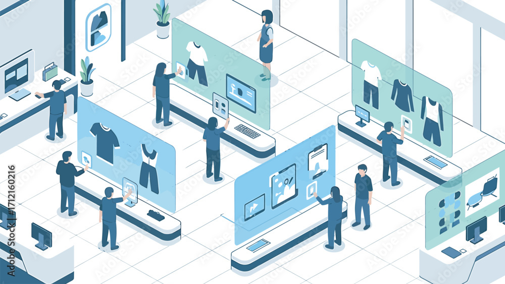 People interact with digital displays showcasing clothing and electronics in a modern retail store, highlighting the integration of technology and shopping experience. #1712160216