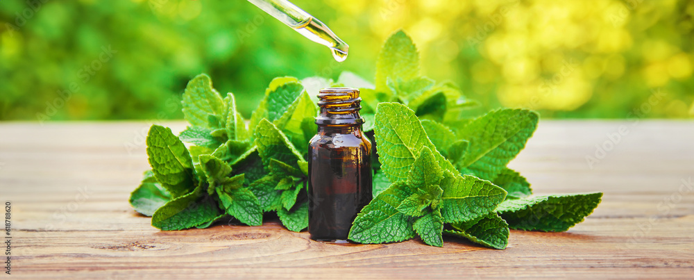 Peppermint essential oil in a small bottle. Selective focus. #618788620