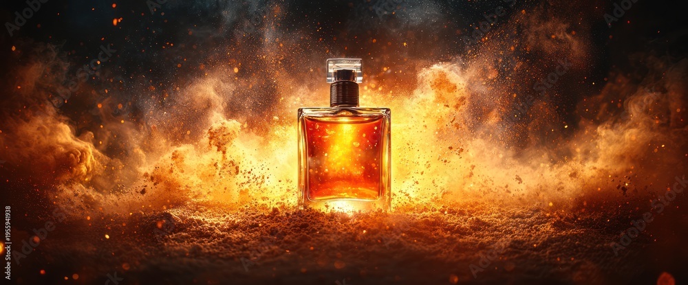 Perfume bottle amidst fiery explosion; dramatic, intense background; advertising image #1955941938