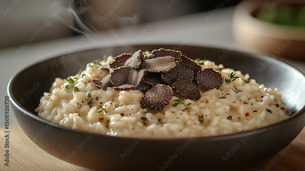 Perigord Truffle Shavings on Risotto - Aromatic Flakes on Creamy Rice with Steam in Morning Light #1568926738