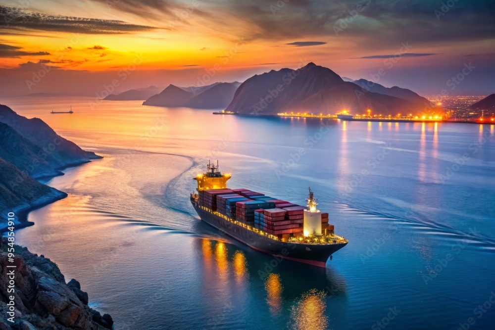 Persian Gulf in June, a stunning low-light shot of a cargo ship navigating through the busy Strait of Hormuz, with the Iranian coastline in the background. #954854910