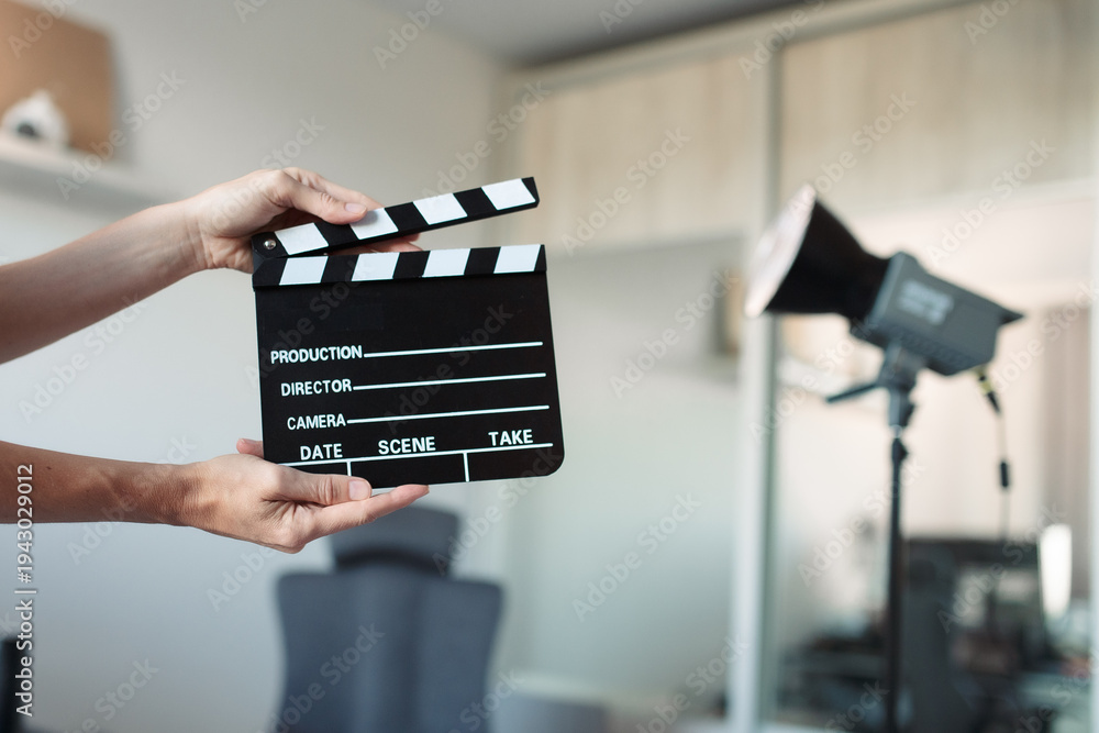 Person holding film clapperboard cueing start of production, motion video or picture, content creation #1943029012