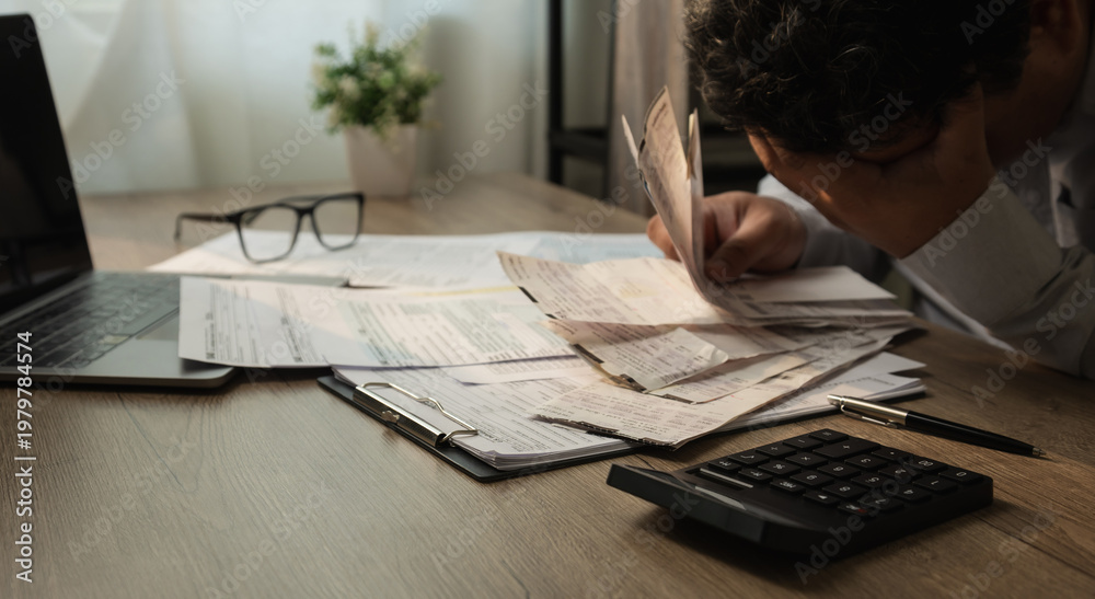 Person holding receipts and reviewing financial documents with calculator during expense tracking and budgeting process, showing financial stress in accounting analysis and personal finance management #1979784574