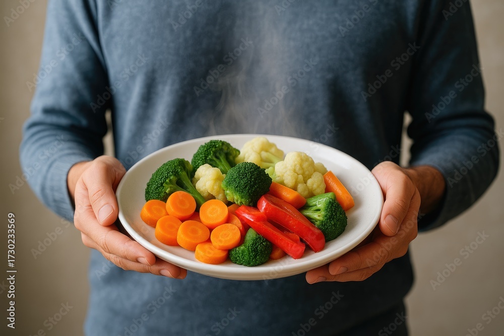 Person in blue sweater holds white plate of colorful steamed vegetables: broccoli, cauliflower, carrot coins, and red bell pepper #1730233569
