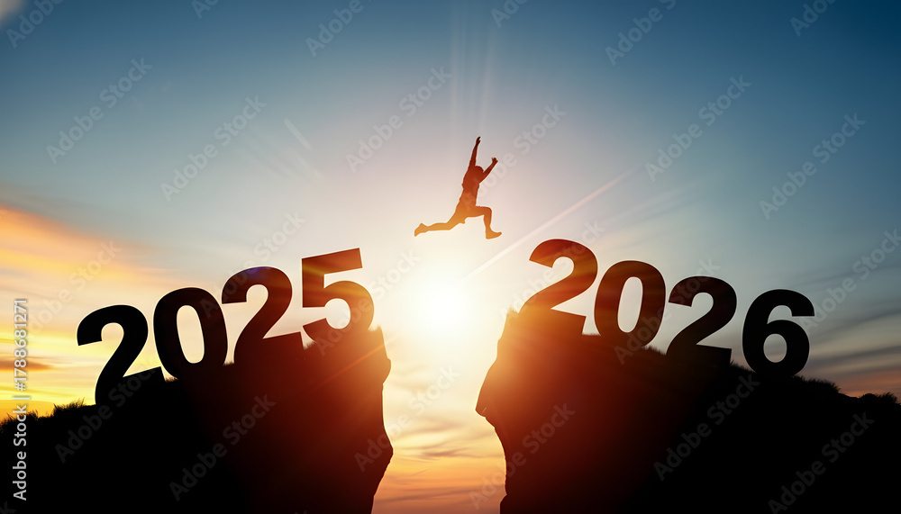 Person jumping between 2025 to 2026 at sunrise symbolizing new year transition, new year 2026 background #1788681271