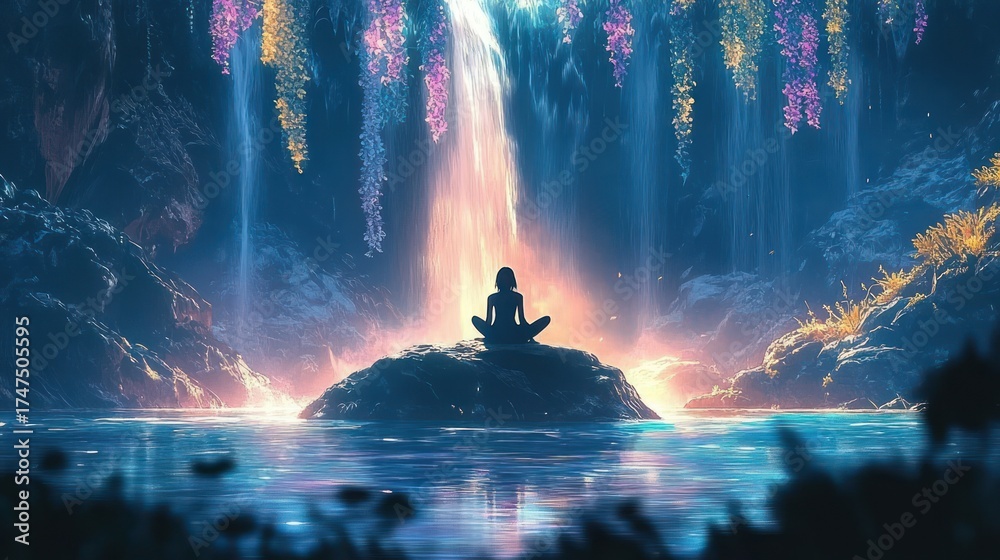 Person meditating peacefully on a rock in the middle of a glowing waterfall surrounded by hanging colorful flowers and serene water #1747505595