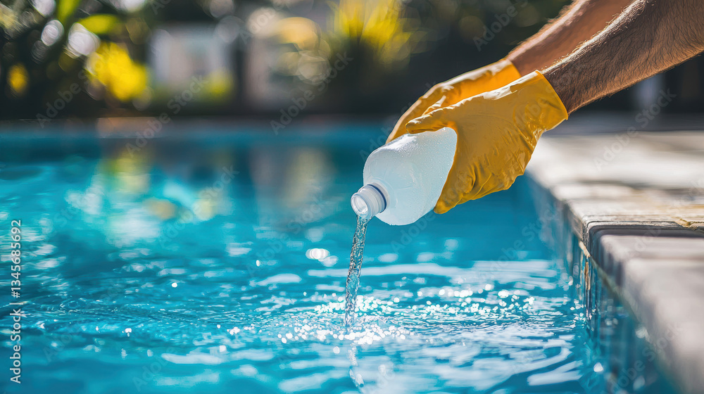 Person pouring liquid chlorine into swimming pool feeling relaxed and enjoying pool maintenance, showing pride in cleanliness #1345685692
