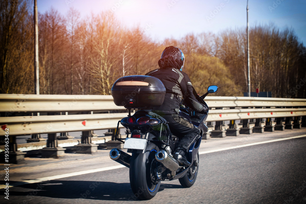 Person rides black sport motorcycle with top case on highway, sun shines, road trip, travel, outdoor adventure, spring weather, blue sky #1936963462