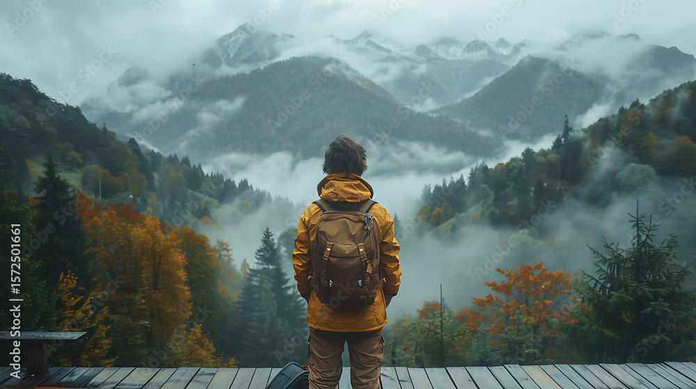 Person standing on deck overlooking foggy mountain range in autumn #1572501661