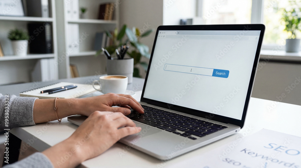 Person uses a laptop to search online in a bright indoor workspace with coffee and notebook nearby #1953033322