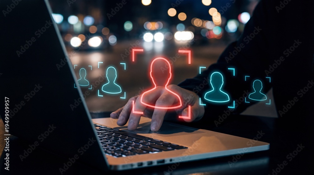 Person using laptop with digital icons and city lights in the background at night #1949909957