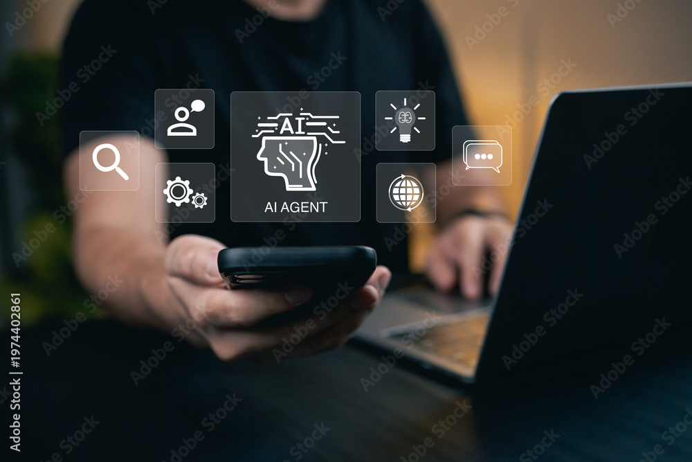 Person Using Smartphone to Interact with AI Agent Features and Technology Icons on Laptop Display in Modern Office Environment #1974402861