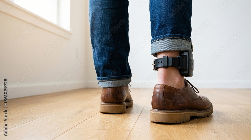 Person wearing electronic ankle monitor standing on wooden floor in a room with white walls and window #1861099728