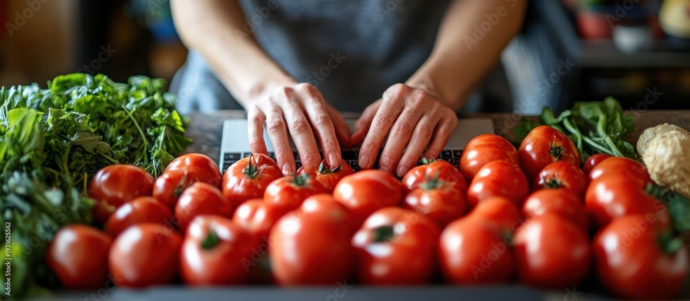 Person working on laptop surrounded by tomatoes #1931625562