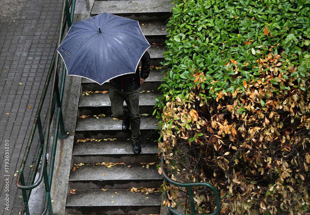 Persona bajo el paraguas bajando escalera en día de lluvia y tormenta #1793631880