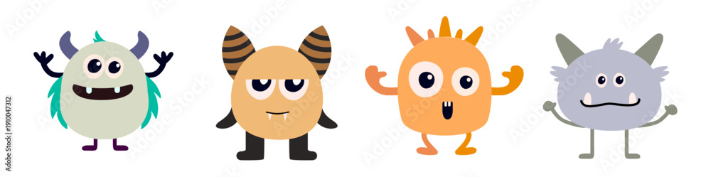 Personajes y monstruos en estilo cartoon, criaturas fantásticas coloridas, aliens simpáticos, arte infantil, monstruos creativos, íconos lúdicos, colección de vectores. #1910047312