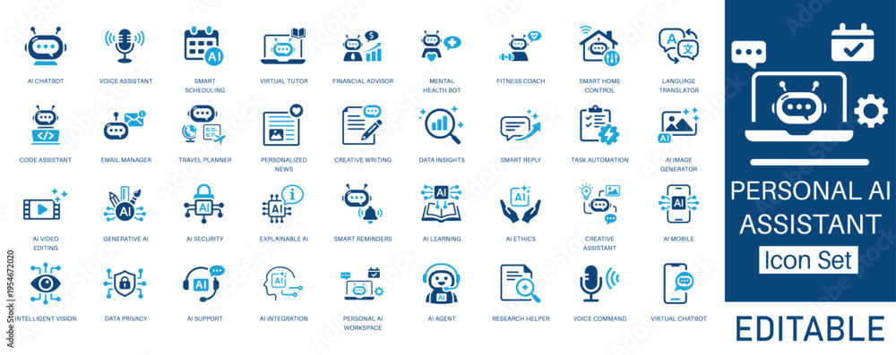 Personal AI Assistant and AI Agent solid icon set. Featuring AI chatbot, voice assistant, generative AI, virtual tutor and AI image generator. Vector icons for tech startup and digital projects. #1954672020
