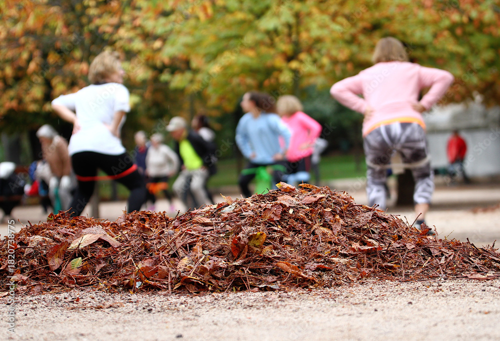 Personas haciendo ejercicio, estiramiento y flexibilidad con banda elástica con montón de hojas caídas de otoño amontonadas #1820738775