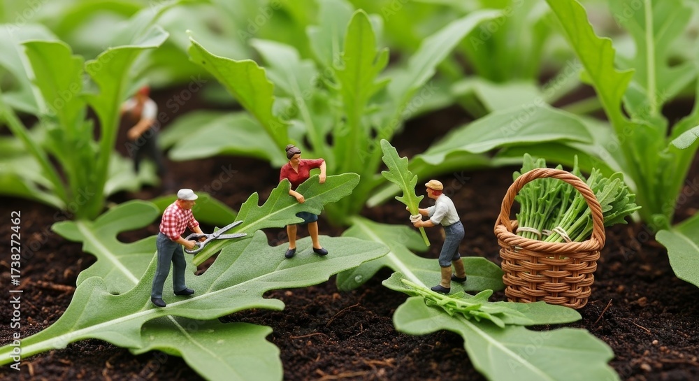 Personas miniatura trabajando en un cultivo de rúcula en un jardín durante una soleada tarde #1738272462