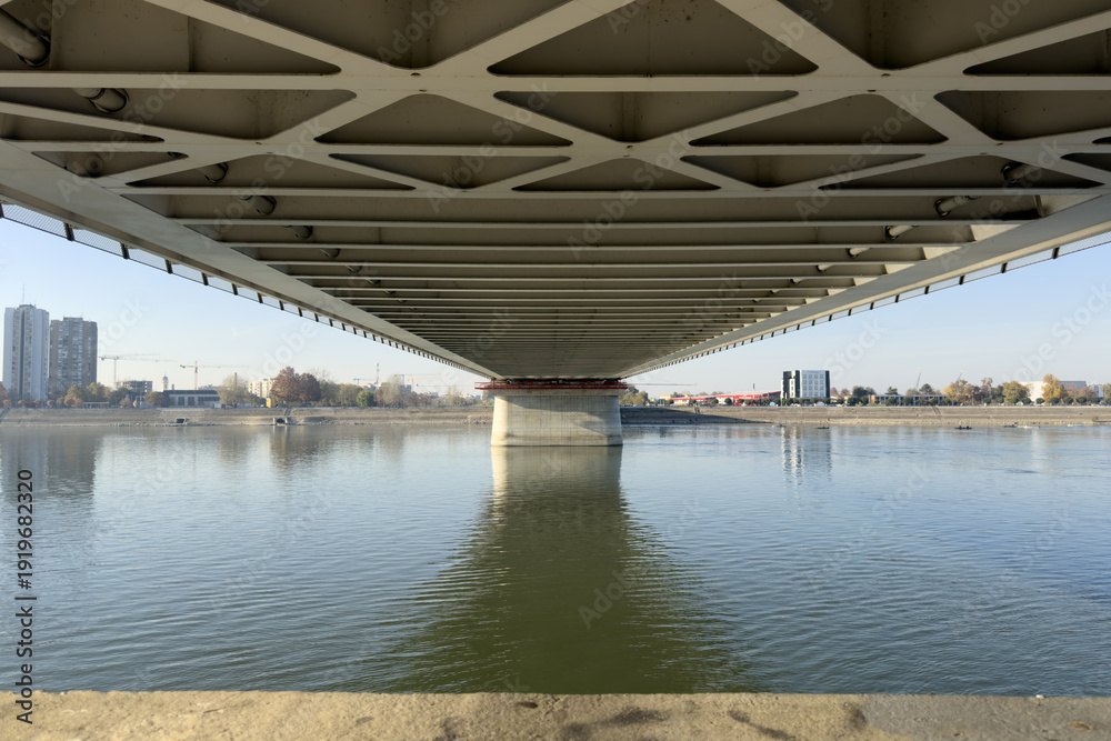 Perspective under bridge with city skyline and autumn trees #1919682320