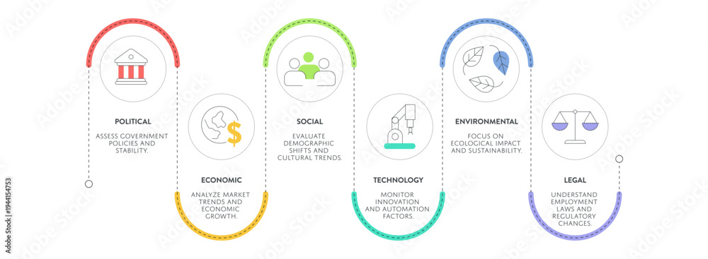 PESTEL Analysis Infographic Vector template. Evaluate 6 macro environmental factors including political, economic, social, technology, environmental, legal. Comprehensive business Presentation Slide. #1944154753