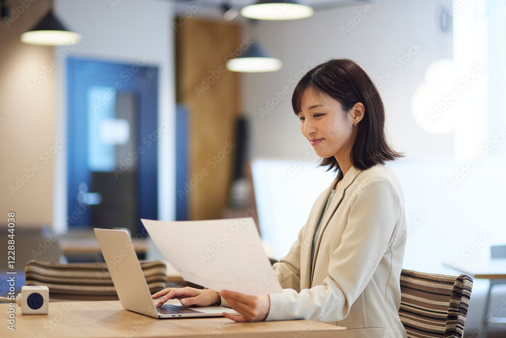 オフィス内でノートパソコンで仕事をする笑顔の日本人ビジネスウーマン #1228844038