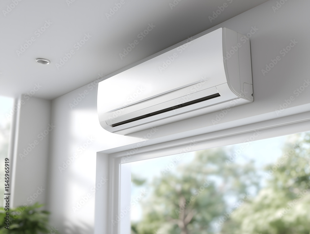 白い室内壁に設置された最新型エアコンと明るい窓辺 #1545965919