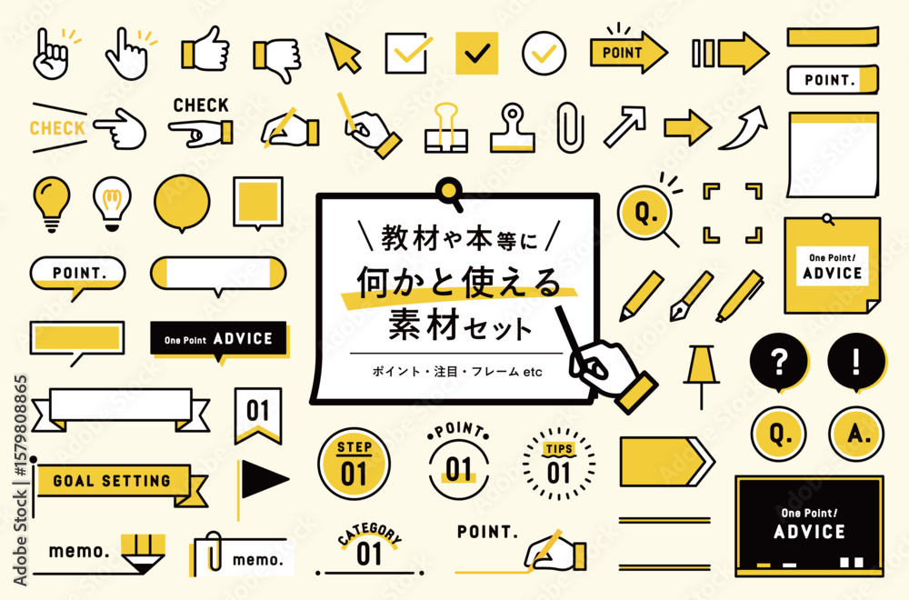 教材・本等に使えるアイコン・フレームの素材セット ポイント 注目 手 勉強 学習 あしらい 飾り 枠 #1579808865