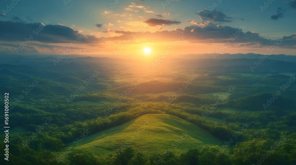 鮮やかな日の出が丘陵地の緑の木々の上空を照らす壮大なシーン #1691080502