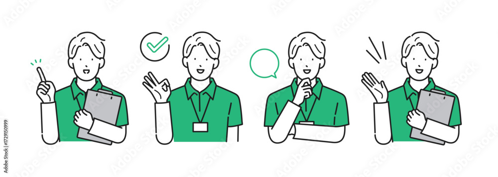 イラスト素材【介護イメージ】:様々なポーズをとる介護福祉士の男性・シンプルタッチ #1729150999