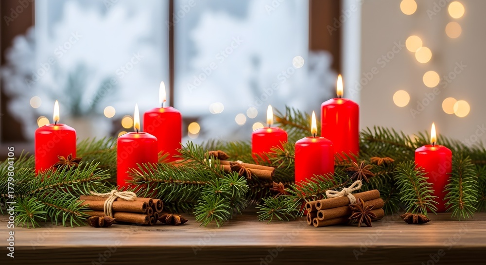 Ζεστά Χριστούγεννα: Ένα γοητευτικό εορταστικό σκηνικό με έντονα κόκκινα κεριά που τρεμοπαίζουν ανάμεσα σε φρέσκες πράσινες πευκοβελόνες και αρωματικά ξυλάκια κανέλας, δημιουργώντας μια ζεστή και. #1779804106