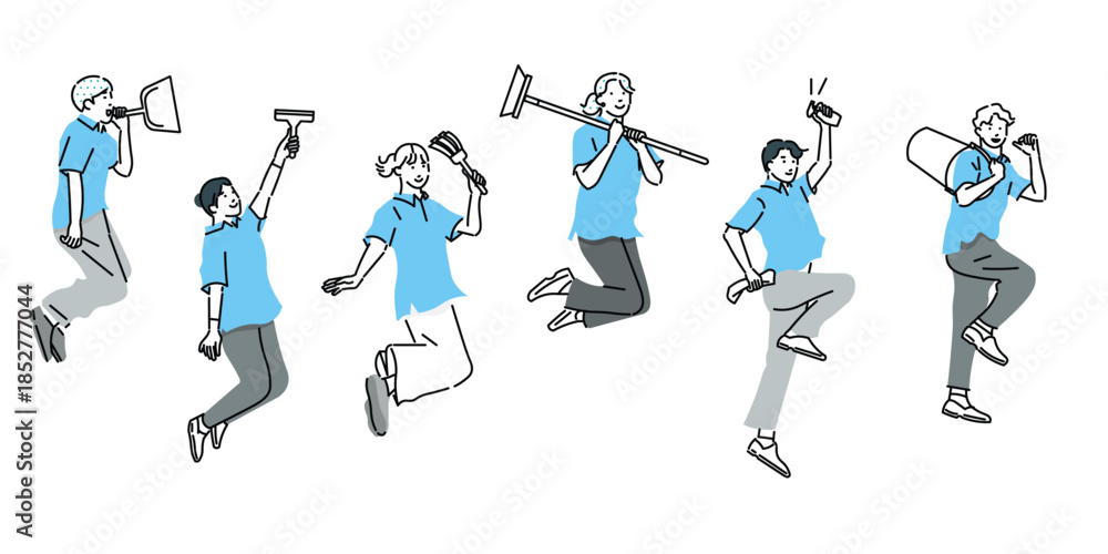 ブラシや掃除道具を持ってジャンプする清掃員ーチームワークーハウスクリーニングーベクター人物イラスト #1852777044