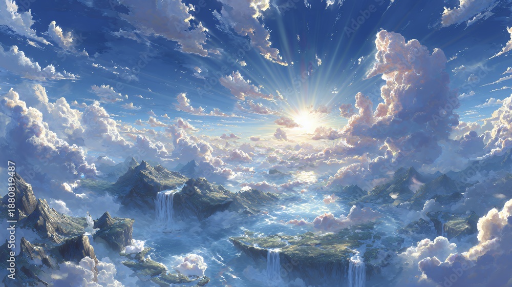 雲海・太陽・光芒が描く幻想の空、雲と浮島と滝、海と山岳の大パノラマ #1880819487