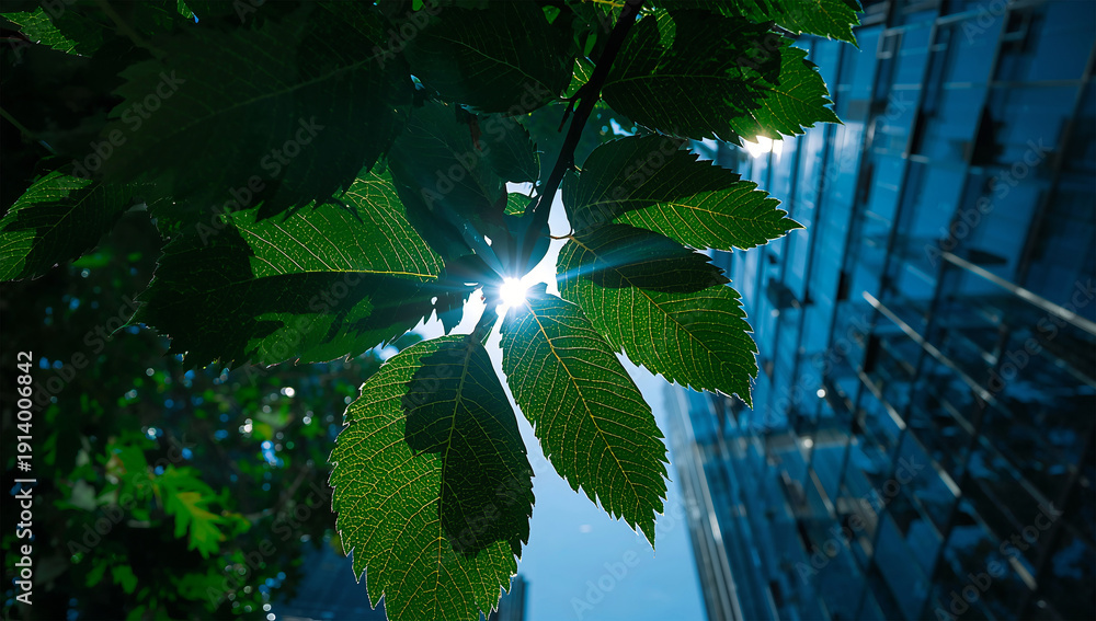 ガラスの谷間で見上げる街路樹の木漏れ日と青い空 #1914006842