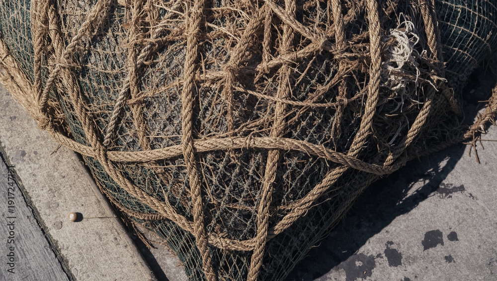 港の市場で乾いた漁網とロープの束を質感重視で接写記録 #1917247121