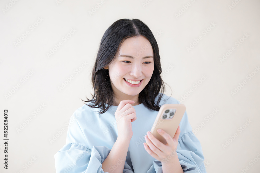スマホを操作する笑顔の女性 オンライン利用・サービスなどの口コミや申し込みをするイメージ スマホを見る #1922084012