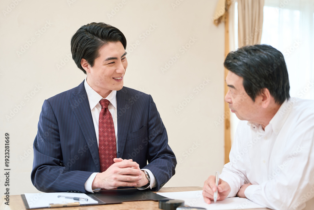 士業のサポートで書類を記入するシニア男性 #1923281669