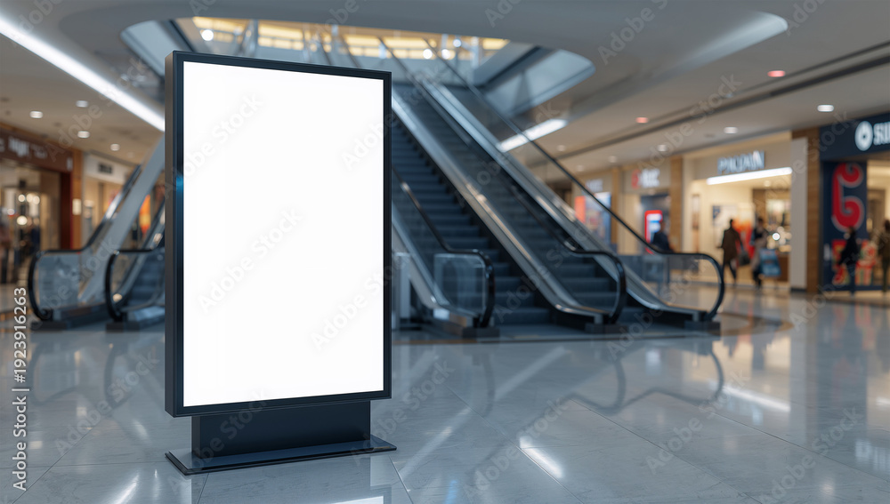 ショッピングモールのエスカレーター前に立つ白い広告看板 #1923916263