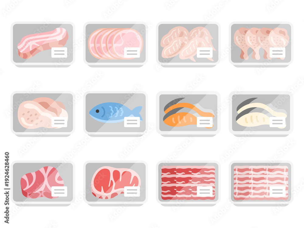 スーパーのパックに入った、鮮魚とお肉のアイコンのイラストセット #1924628460