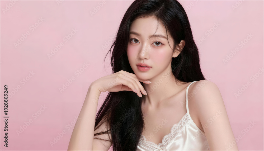 白いキャミソール姿でカメラを見つめる美しい黒髪の女性 #1928809249