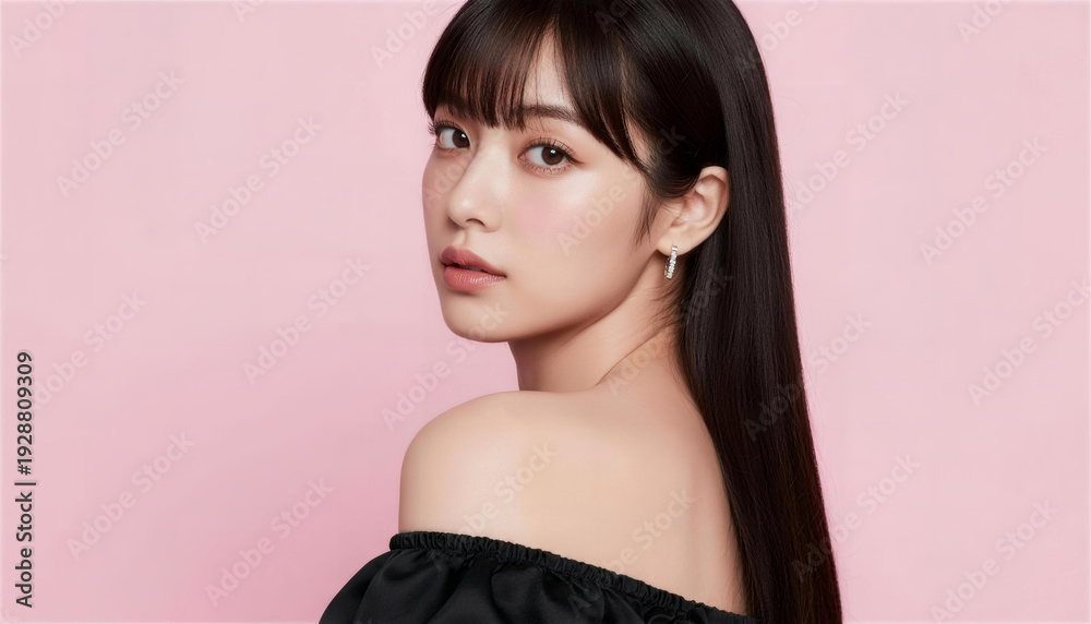ピンク背景の前で肩を出して振り返る美しい黒髪の女性 #1928809309