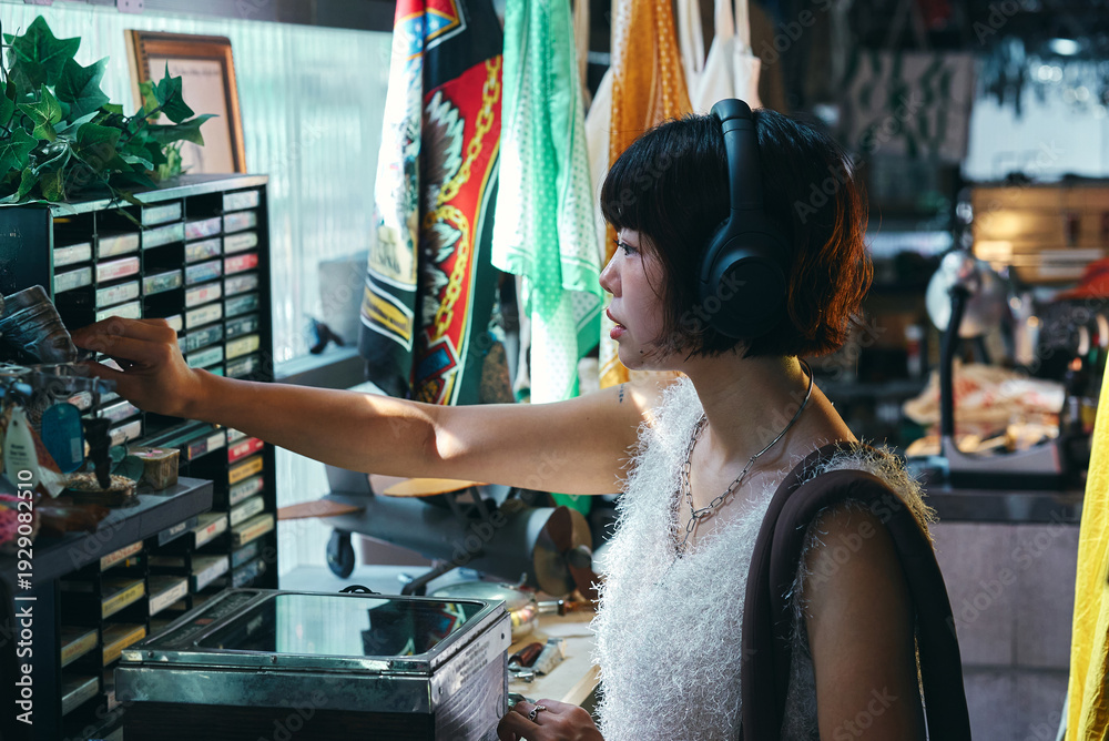 レトロなアイテムが並ぶビンテージショップで買い物をする若い女性 #1929082510