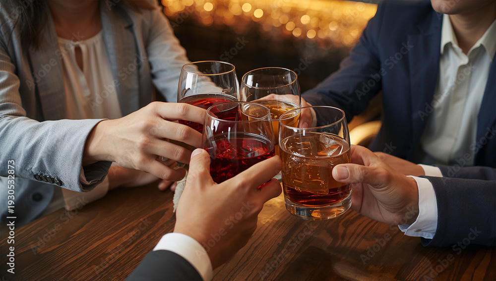 仕事帰りに乾杯する日本人ビジネス仲間の手元とグラス、服装をスーツに変更 #1930532873
