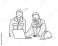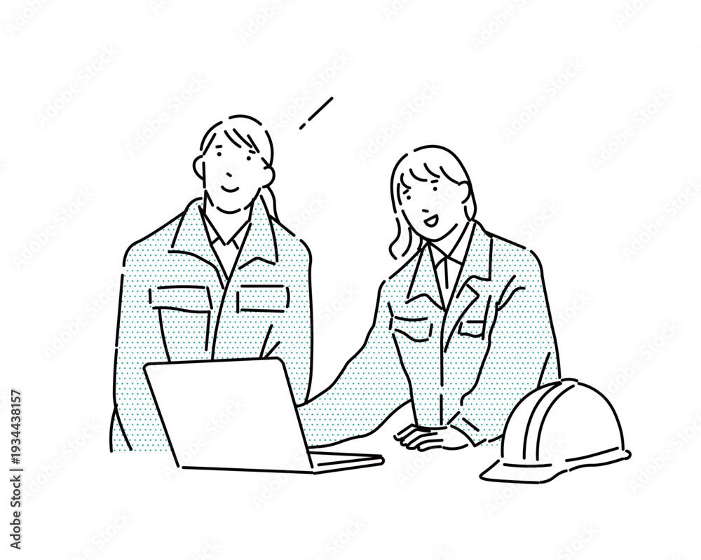 パソコンとヘルメットー作業服の女性二人が話し合うシーンー上半身ー事務仕事のベクターイラスト素材 #1934438157